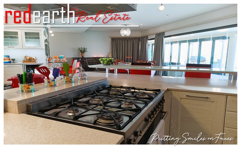 Luxurious Entertainment Oasis: This stunning property boasts an outdoor entertainment area perfect for alfresco gatherings. Key features include a built-in pizza oven and solar-heated swimming pool, seamlessly integrated with the interior living space via expansive sliding glass doors that open onto a spacious veranda. A portion of the veranda adjacent to the pizza oven is tastefully enclosed with glass panels, providing wind protection while maintaining an open-air ambiance.